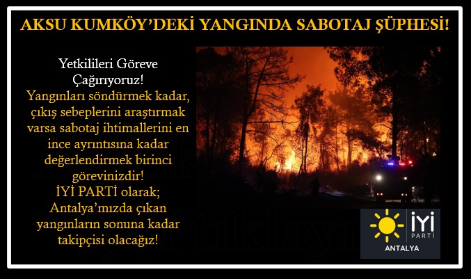 İYİ Parti Antalya İl Başkanı Ali Adnan Kaya, Aksu ve Alanya’da çıkan orman yangınlarının sebeplerinin detaylıca incelenmesi gerektiğini ifade ederek; ‘’Aldığımız duyumlara göre özellikle Aksu ilçemizde başlayıp Serik’e kadar ulaşan orman yangınlarında ciddi sabotaj kuşkusu bulunmaktadır’’ dedi.