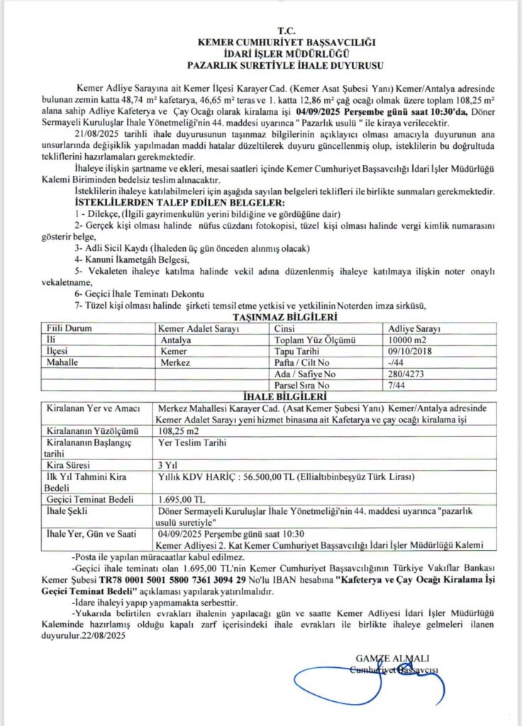Kemer Adliye sarayına ait Kemer ilçesi Karayer caddesi mevkiinde Kemer Antalya adresinde zemin katta bulunan 48.74 m2 kafeterya , 46.65 m2 teras ve 1. katta 12.86 m2 çay ocağı olan ve toplamda 108.25 m2 alana sahip Adliye kafeterya ve çay ocağı kiraya verilmek üzere ihaleye çıkarılıyor.
